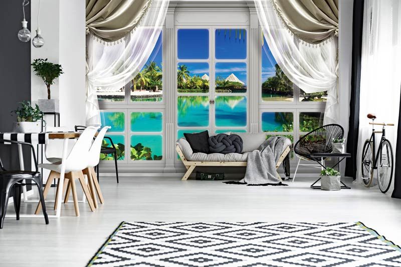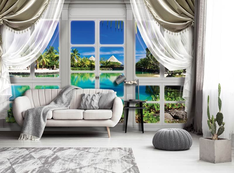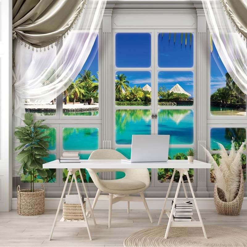 3D vliesbehang van het uitzicht op het hemelsblauwe water in Hawaï, gezien vanuit het raam.