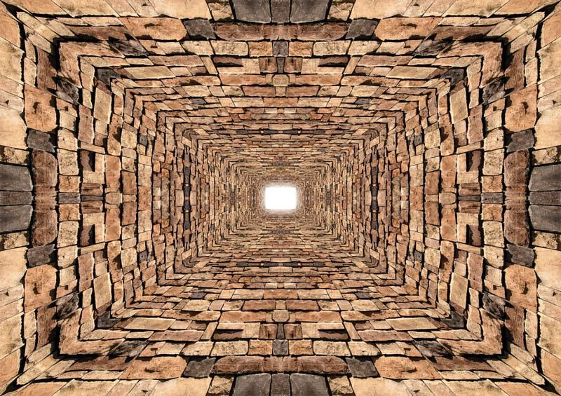 3D Fotobehang van een stenen tunnel die in het oneindige door lijkt te lopen.
