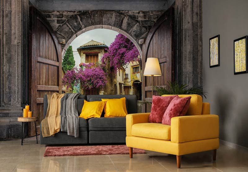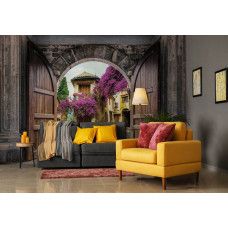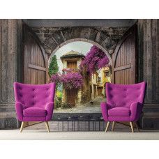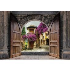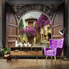 3D fotobehang van het uitzicht tussen de kasteeldeuren door, op een oud stadje.