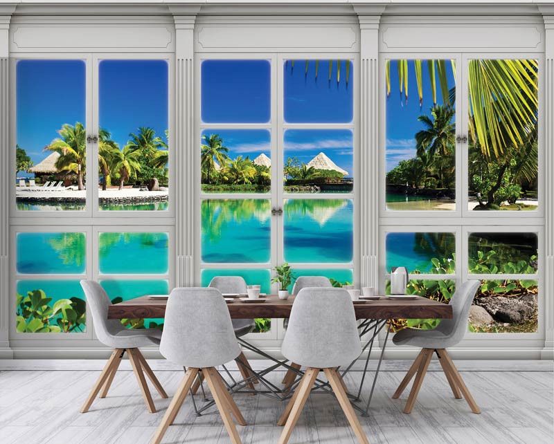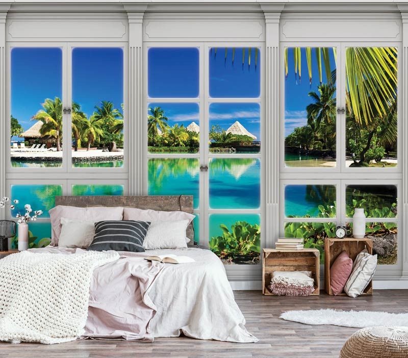 3D vliesbehang van het uitzicht op het hemelsblauwe water in Hawaï, gezien door het raam. Dit fotobehang zorgt voor een geweldig 3D-effect in de: woonkamer, slaapkamer, kinderkamer, hal, school, keuken, kantoor of iedere andere ruimte.