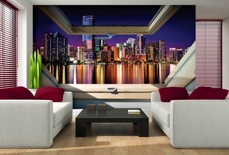3D Fotobehang uitzicht op New York in de nacht vanuit het raam.