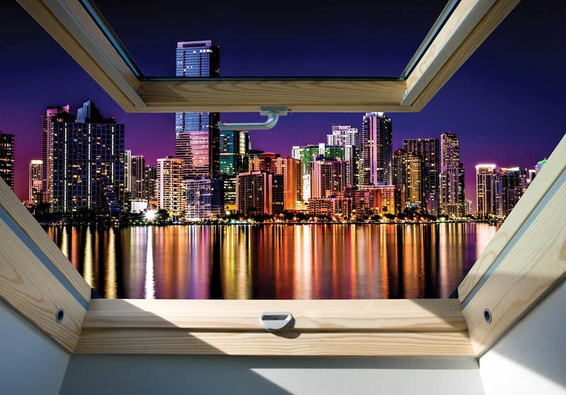 Vlies fotobehang van het uitzicht op de Amerikaanse stad New York in de nacht, vanuit het dakraam, weergeven in 3D.