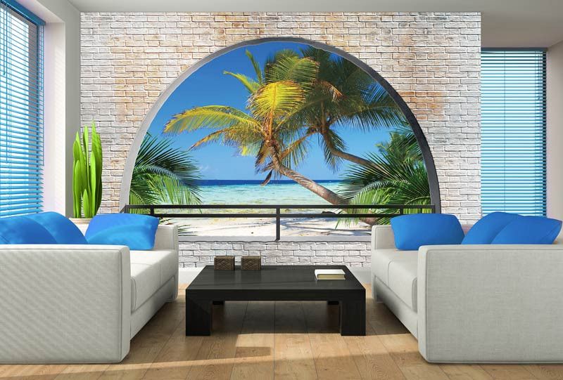 Het fotobehang van het uitzicht op de palmbomen is een echte eyecatcher en geeft een geweldig 3D effect in iedere ruimte.