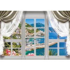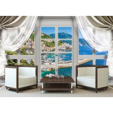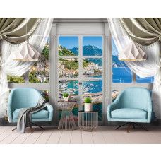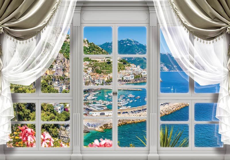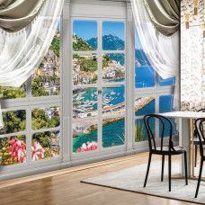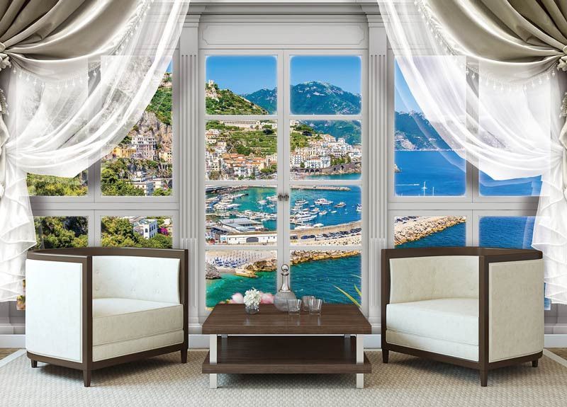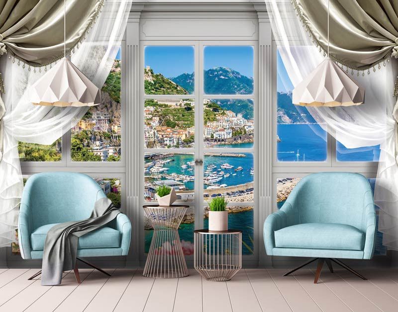 3D vliesbehang van het uitzicht op de stad in de bergen aan zee, gezien vanuit het raam.
