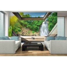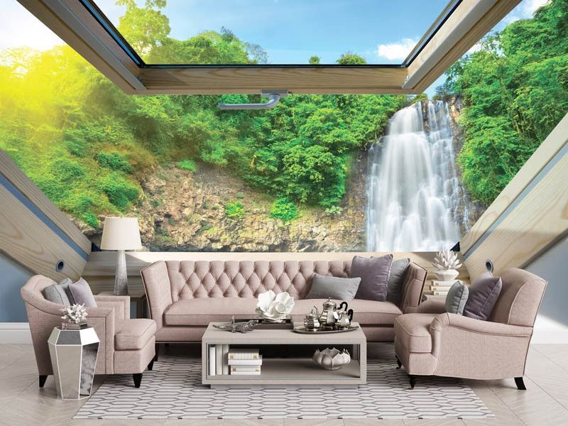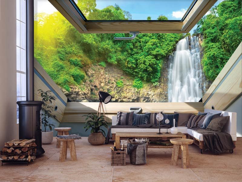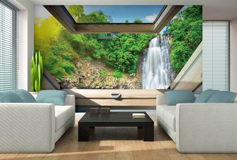 Vlies fotobehang van het uitzicht vanuit het dakraam op een waterval, weergeven in 3D.