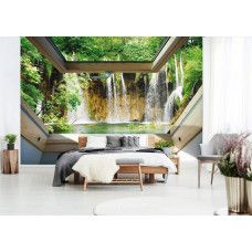 3D Fotobehang uitzicht vanuit het raam op grote watervallen