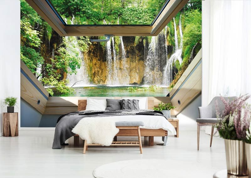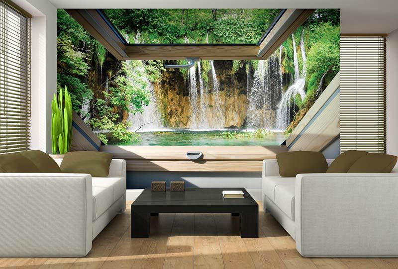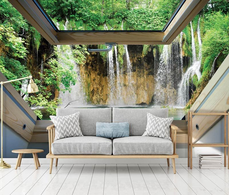 Vlies fotobehang van het uitzicht vanuit het dakraam op een paar grote watervallen, weergeven in 3D.