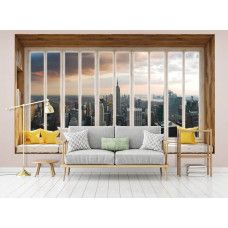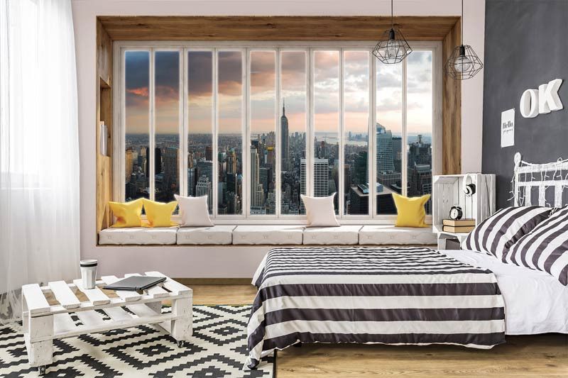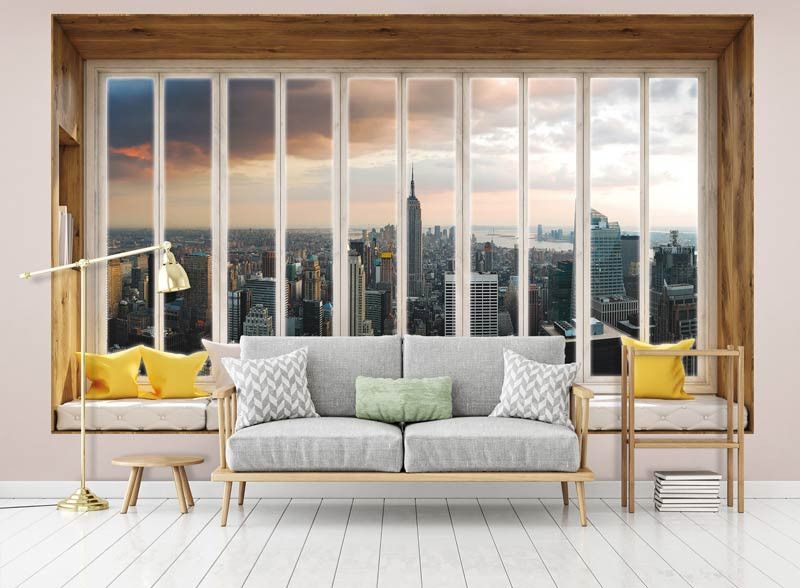 3D vliesbehang van het uitzicht op de wolkenkrabbers van de Amerikaanse wereldstad New York, gezien vanuit het raam.