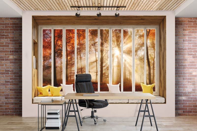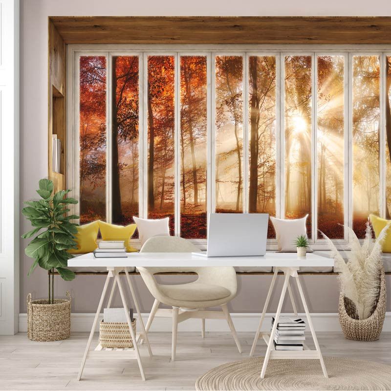 Vliesbehang van het uitzicht op het prachtige, herfstachtig bos, gezien vanuit het raam. Dit zorgt voor een fantastisch 3D-effect!