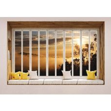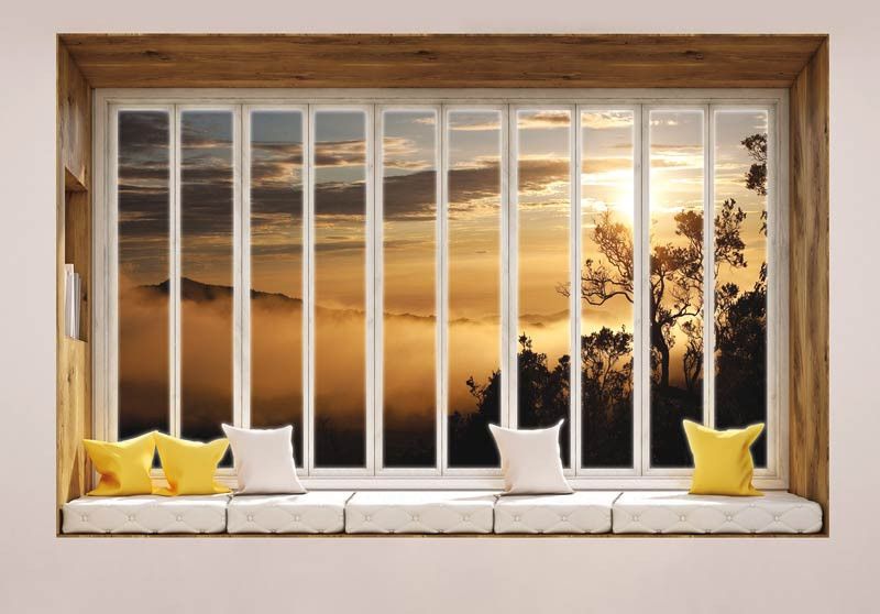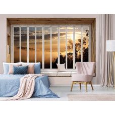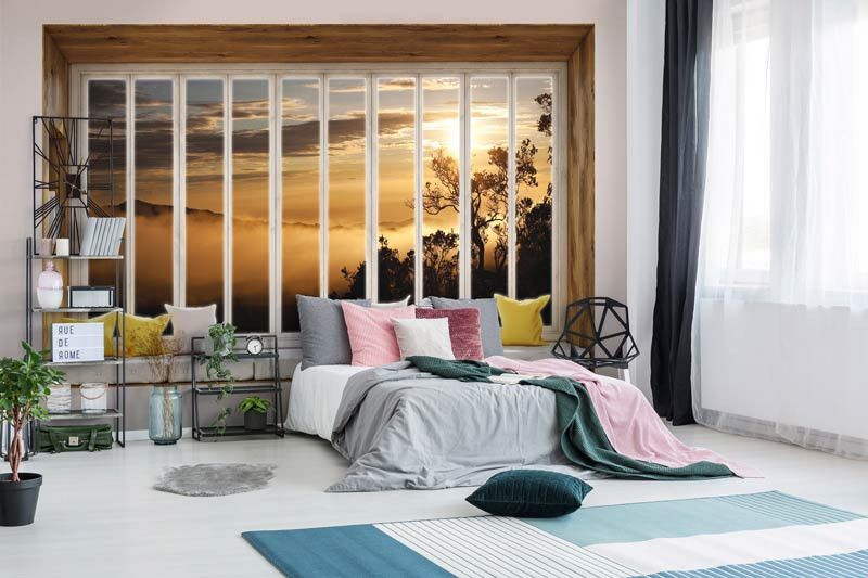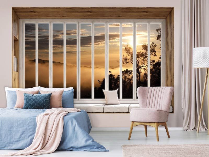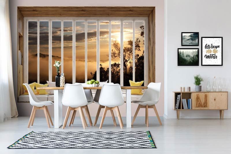 3D Perspectief Fotobehang Uitzicht door het Raam op het Mistige Bos