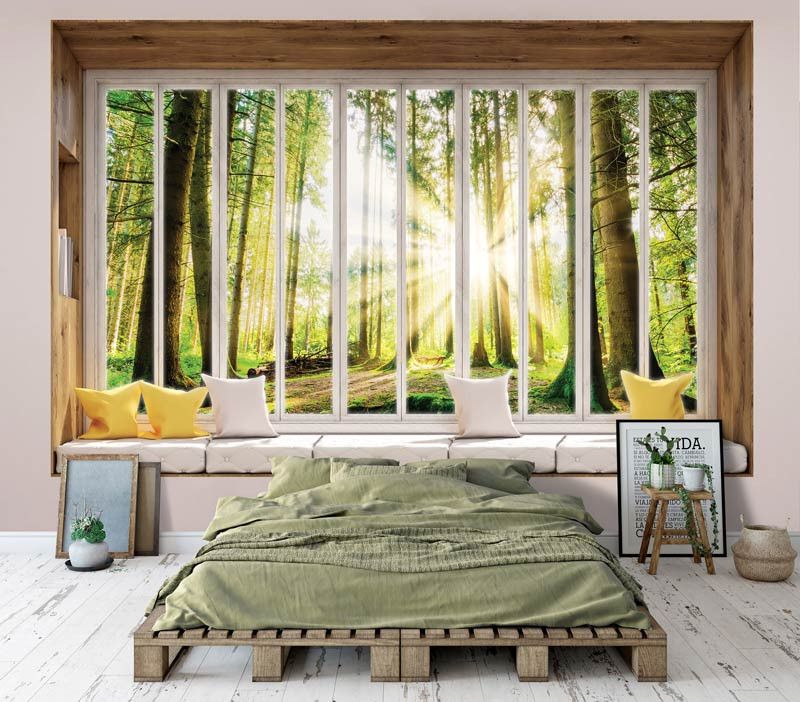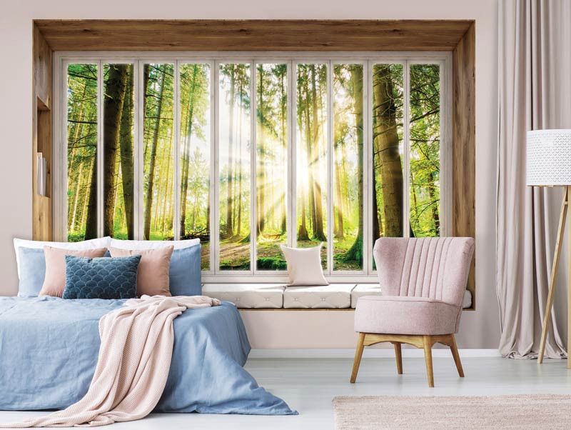 Vliesbehang van het uitzicht op een prachtig, zonnig bos, gezien door het raam. Dit zorgt voor een fantastisch 3D-effect!