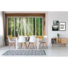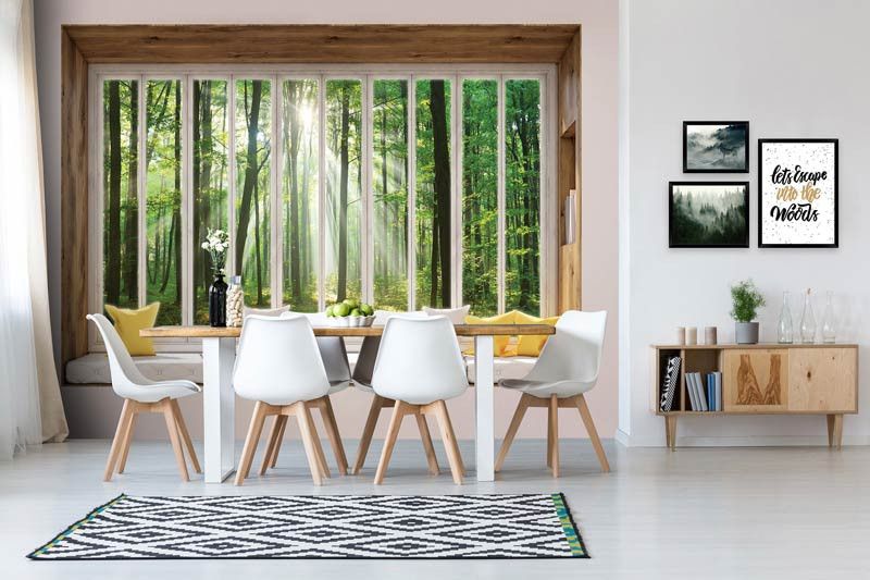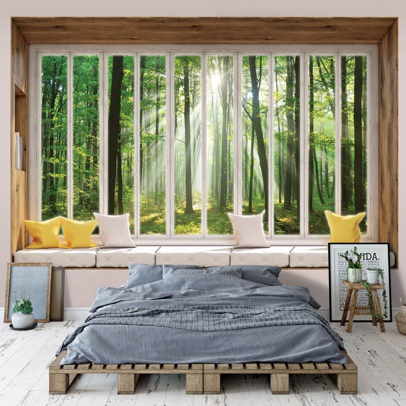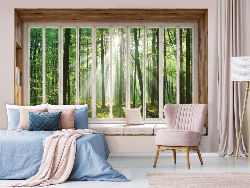 Vliesbehang van het uitzicht op een prachtig, zonnig bos, gezien door het raam. Dit zorgt voor een fantastisch 3D-effect!
