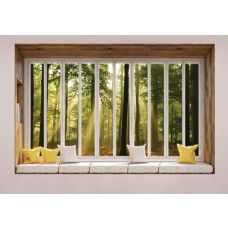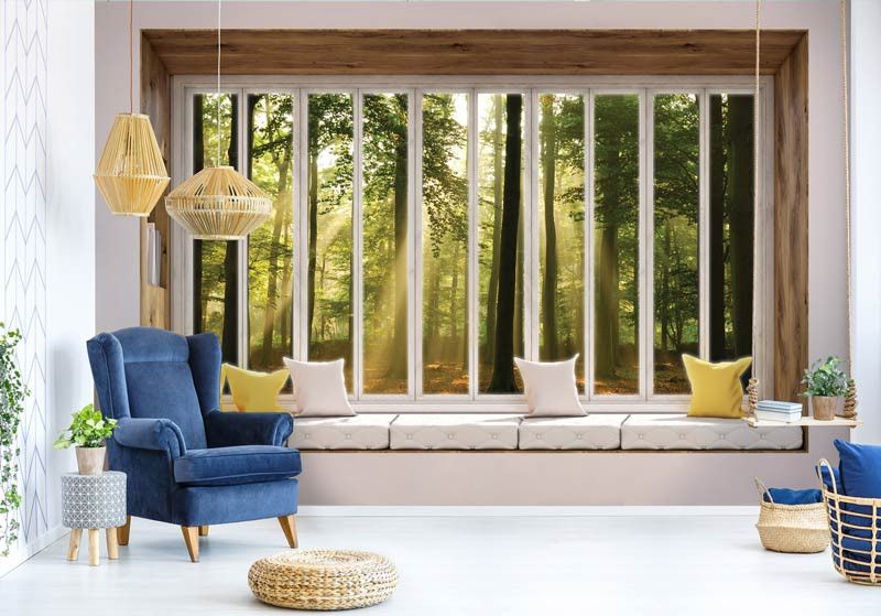 3D Perspectief Fotobehang Uitzicht vanuit het Raam op het Zonnige Bos