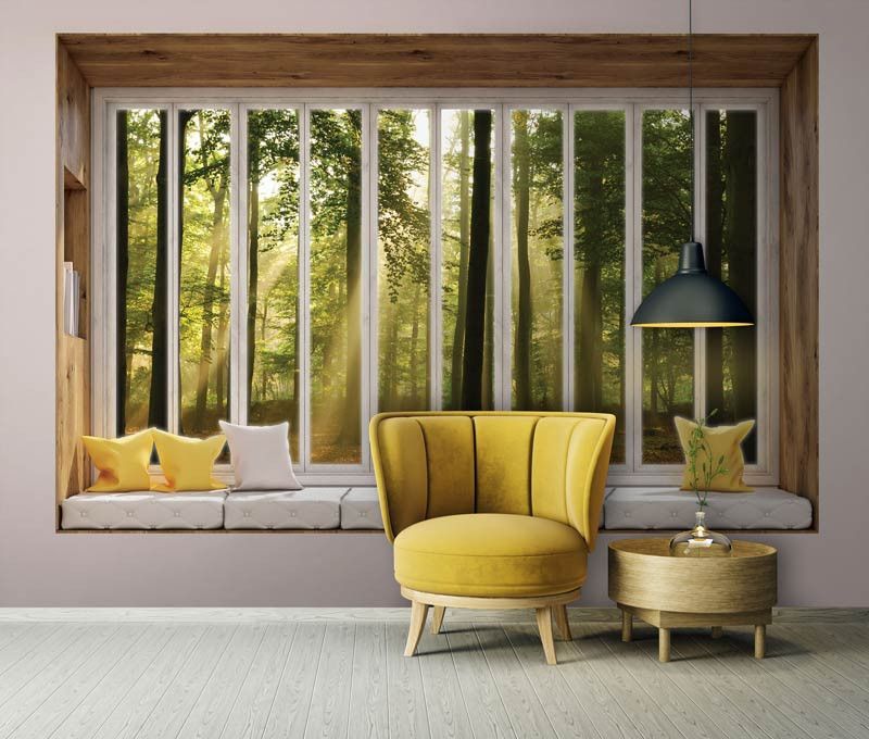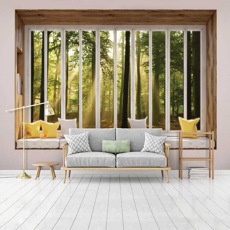 Vliesbehang van het uitzicht op het prachtige, zonnige bos, gezien door het raam. Dit zorgt voor een fantastisch 3D-effect!