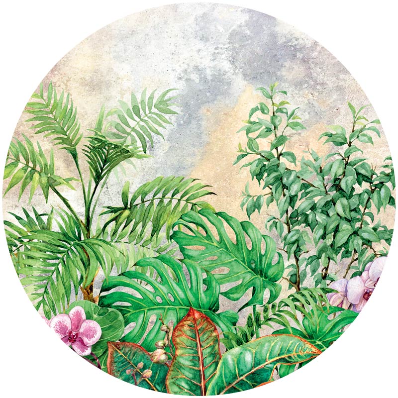 Haal de jungle in huis met de botanische behangcirkel. Op de behangcirkel zijn schitterende exotische, botanische, planten en bladeren te zien.