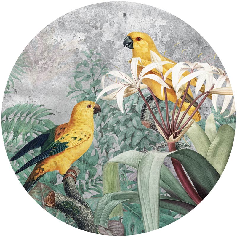 Behangcirkel met een aantal prachtige gekleurde papegaaien in de jungle.