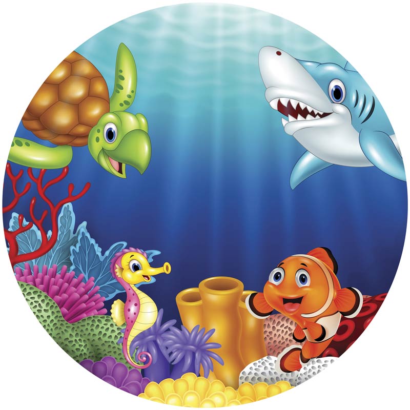 Een schitterende behangcirkel voor de kinderkamer, met daarop een vrolijke: haai, schildpad, zeepaardje en vissen.