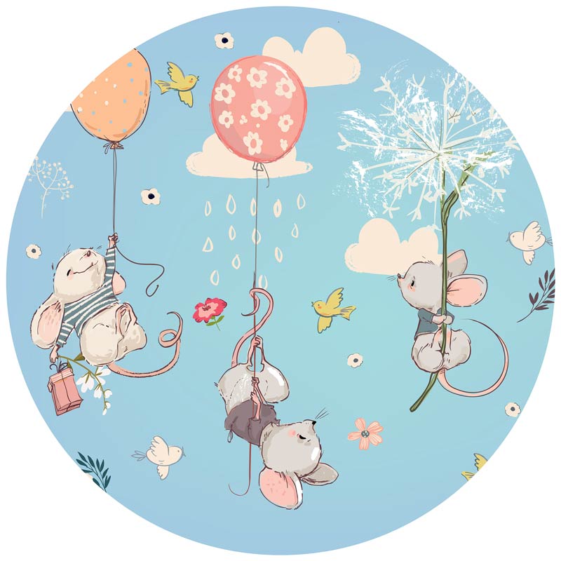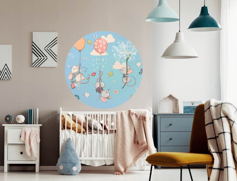 Behangcirkel van drie muizen die zwevend aan ballonnen, rechtstreeks jouw kinderkamer komen binnen vliegen om je cadeautjes te bezorgen!