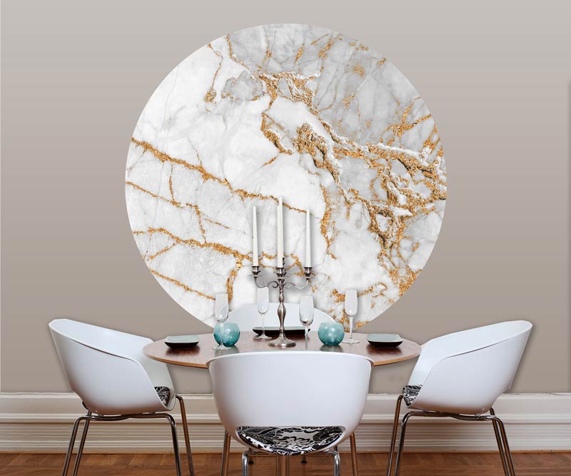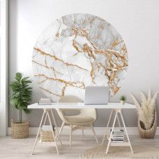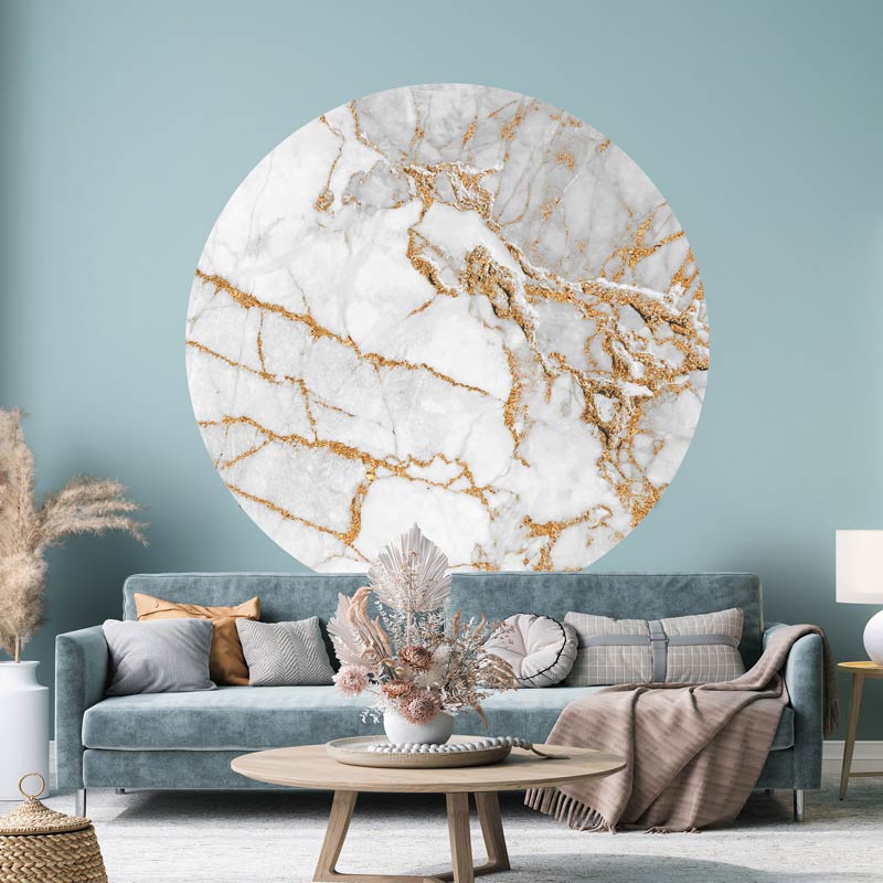 Behangcirkel van een witte marmeren muur met daarin schitterende, goudkleurige lijnen.