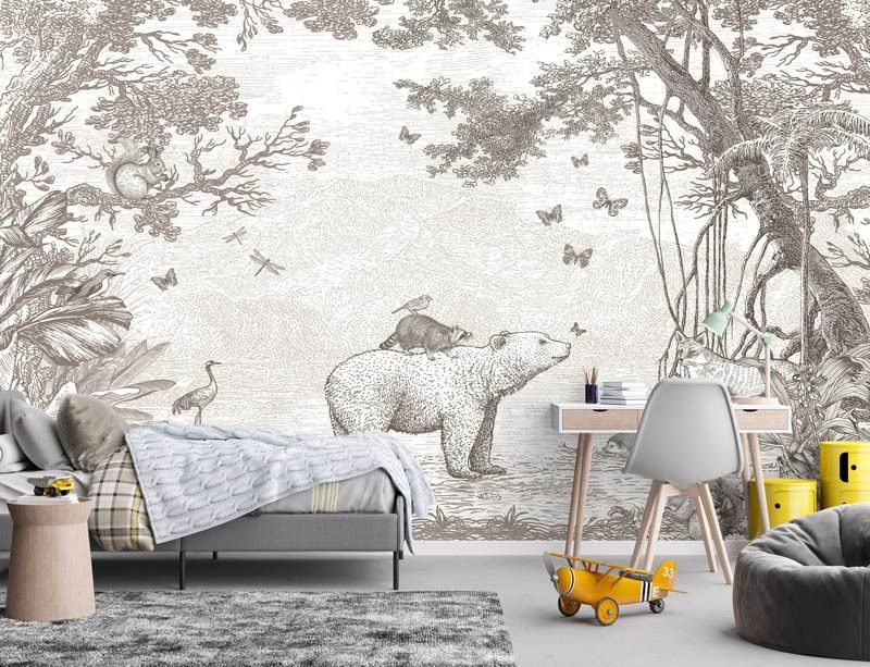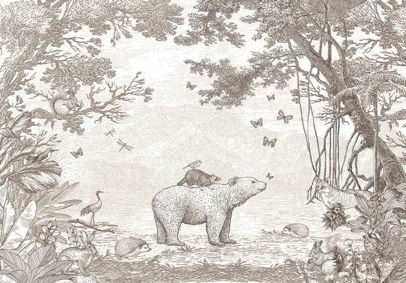 Breng de betovering van het bos naar de kinderkamer met ons bosdieren behang in taupe. Op dit prachtige fotobehang schittert een collectie bosdieren, waaronder een majestueuze beer, omringd door een rustieke bosomgeving. De zachte taupe tinten creëren een warme, natuurlijke sfeer, perfect voor een gezellige en uitnodigende kinderkamer of babykamer.