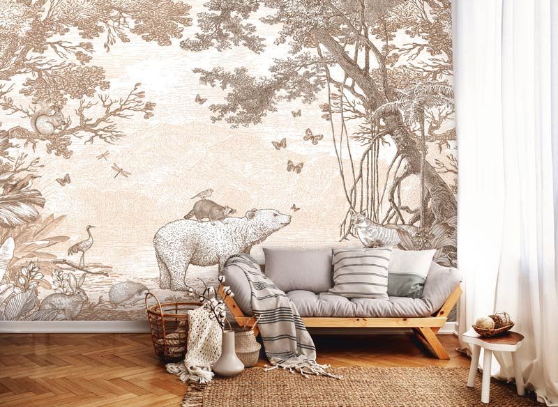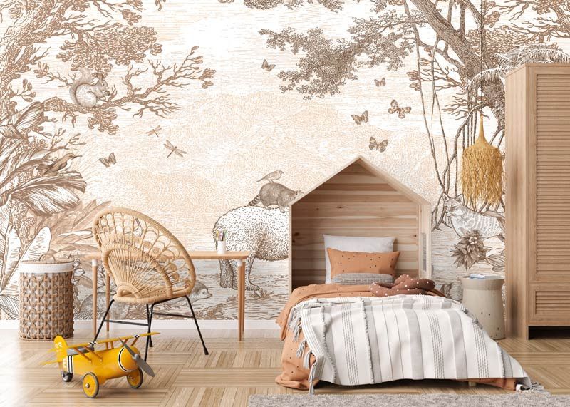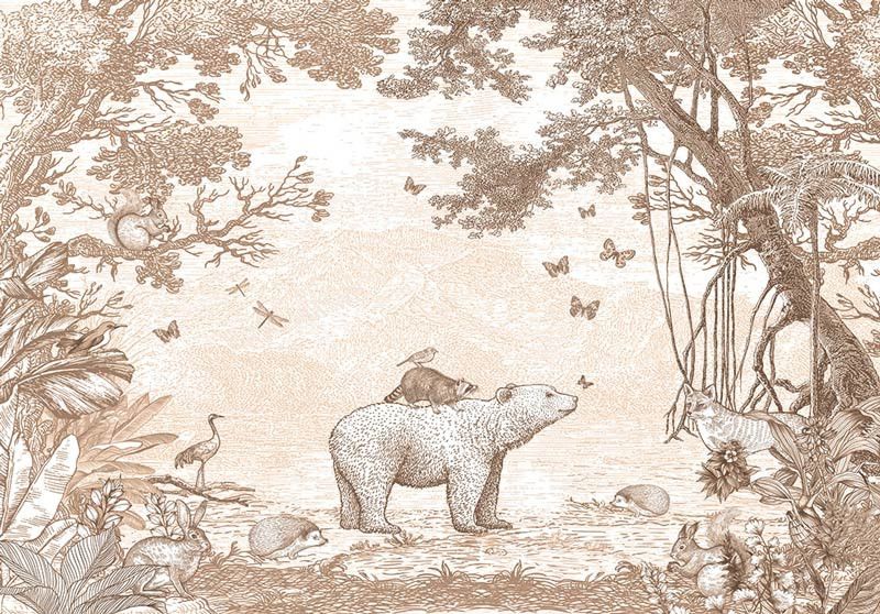Met zijn warme kleuren en tijdloze charme is dit fotobehang een ideale keuze voor de kinderkamer of babykamer. Geef de ruimte een unieke en natuurlijke uitstraling met dit prachtige bosdieren behang in terracotta kleuren.
