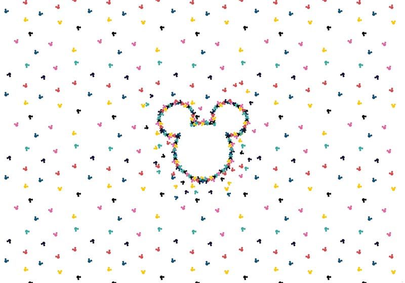 De kleurrijke collage van Mickey Mouse ziet eruit als een kleurrijke regen van confetti aan de muur.