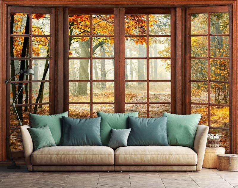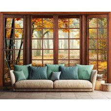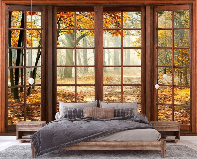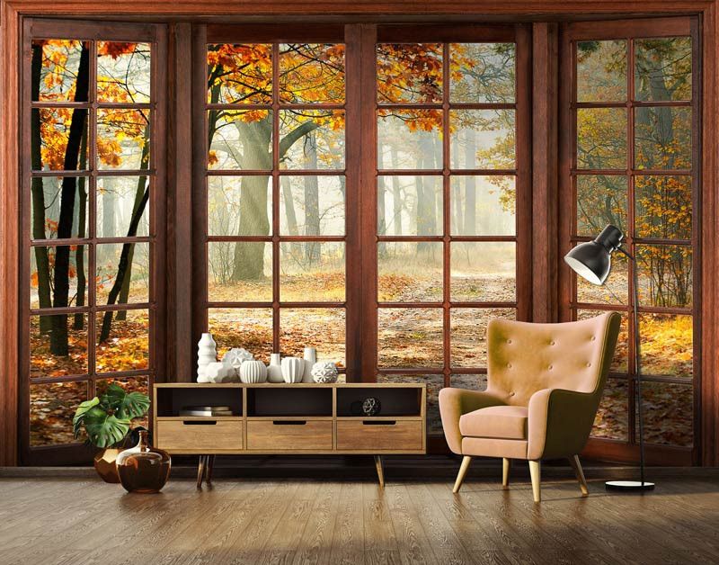 Geniet van het uitzicht op een rustgevend bos met dit 3D-fotobehang. Het lijkt alsof je door een raam naar een prachtig boslandschap kijkt, wat een kalmerende sfeer toevoegt aan elke kamer. Perfect voor de woonkamer, slaapkamer of zelfs een thuiskantoor.