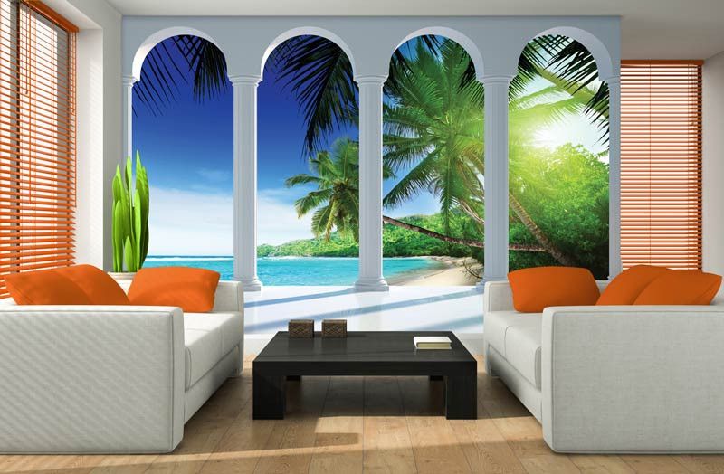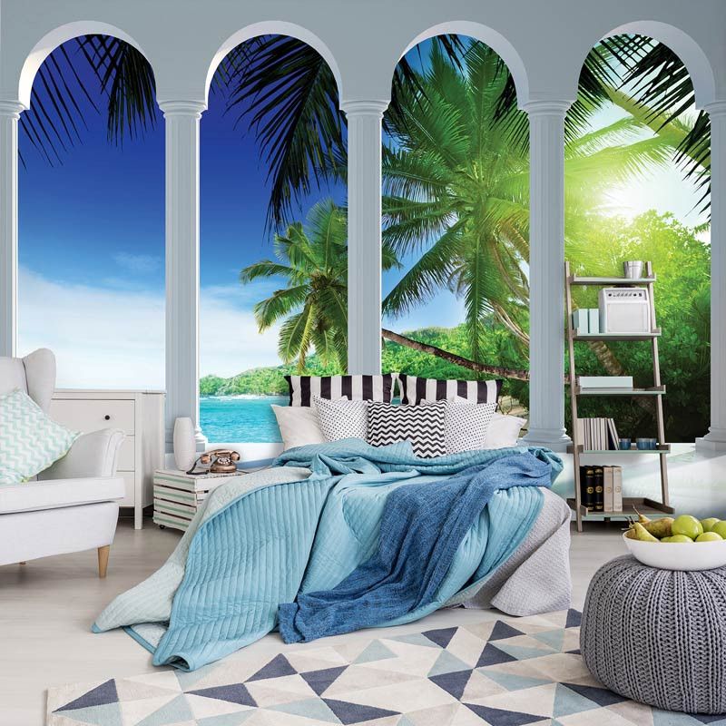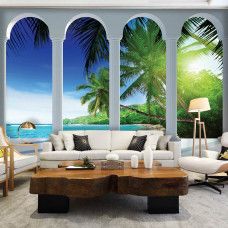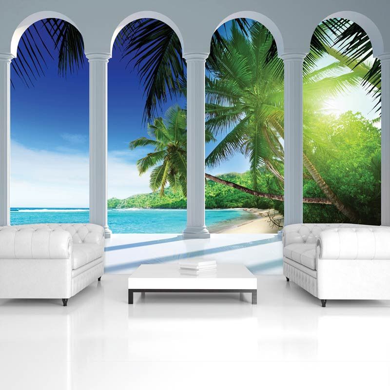 Fotobehang 3D Uitzicht op Palmbomen en Strand
