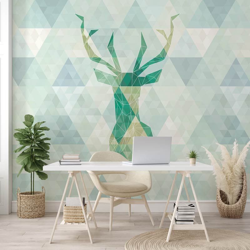 Fotobehang van een geometrisch, abstract kunstwerk met hierin een prachtig hert.