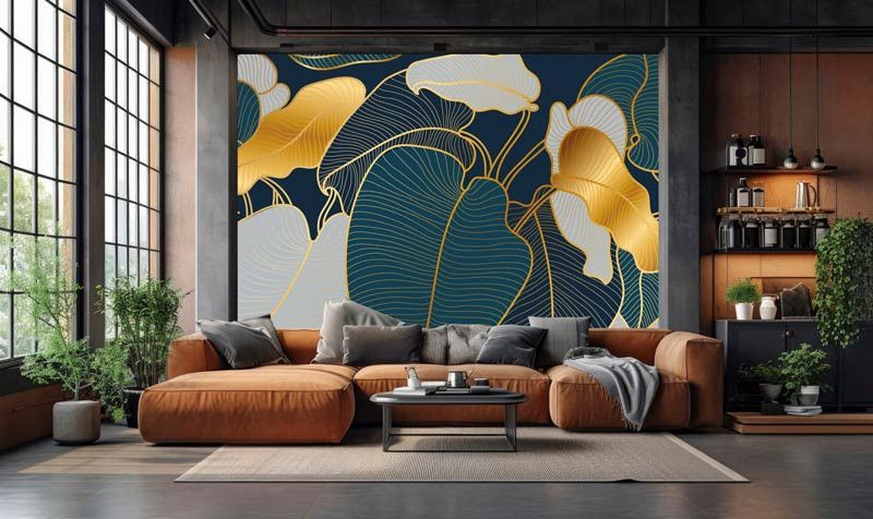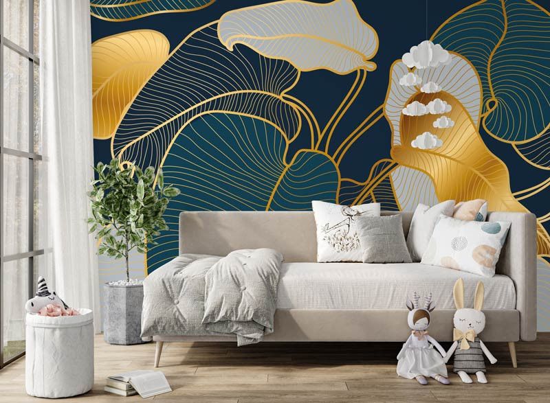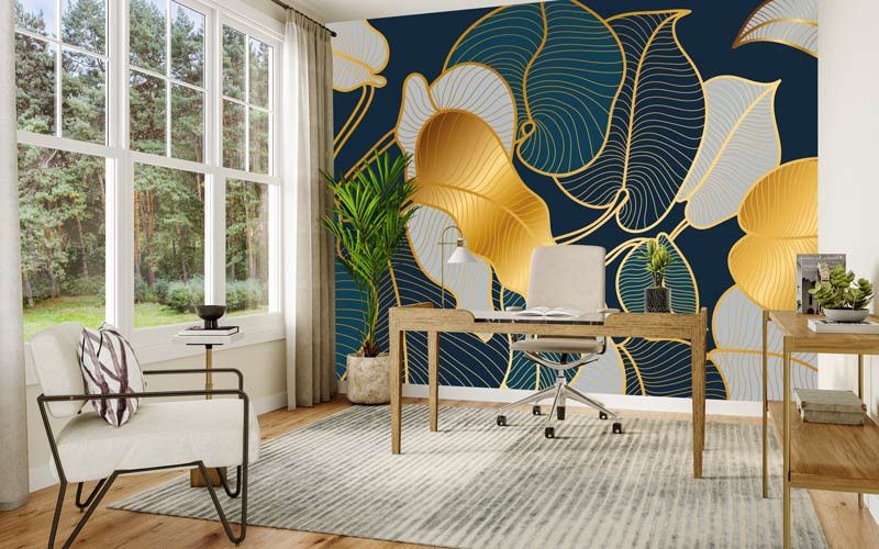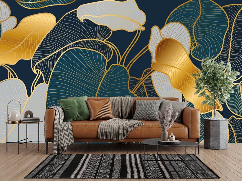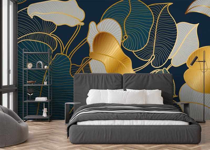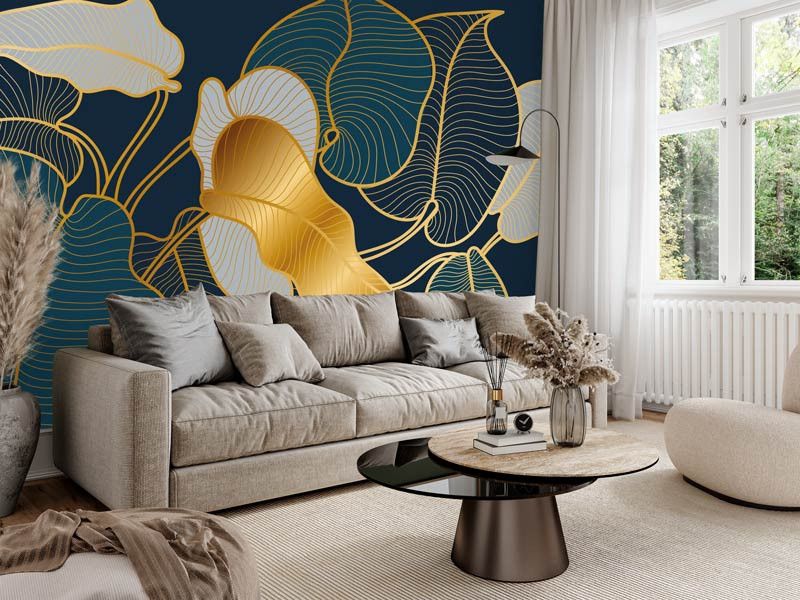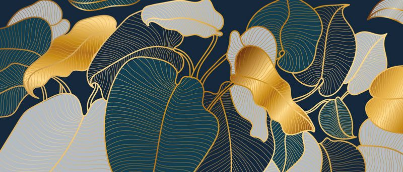 Dit fotobehang toont een verfijnd abstract ontwerp van bladeren, opgebouwd uit elegante gouden lijnen op een diepe donkere achtergrond. De fijne lijnstructuur geeft het dessin een grafische uitstraling, terwijl de goudtinten zorgen voor warmte en luxe.