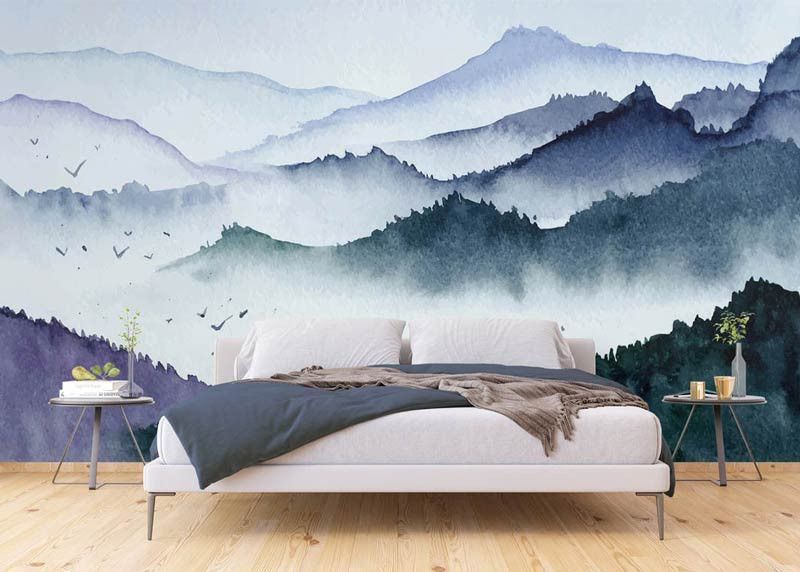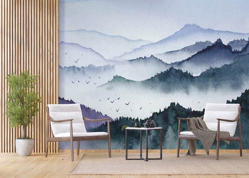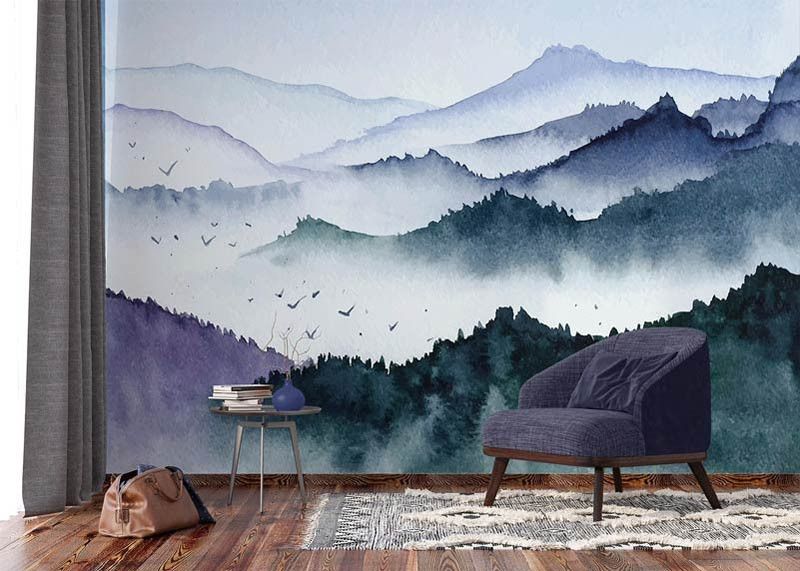 Ervaar de dromerige sfeer van bergen in mist met dit aquarelfotobehang. De zachte blauwtinten en het waterverf-effect creëren een serene uitstraling, ideaal voor ontspannende ruimtes. Dit behang is eenvoudig op maat te bestellen.