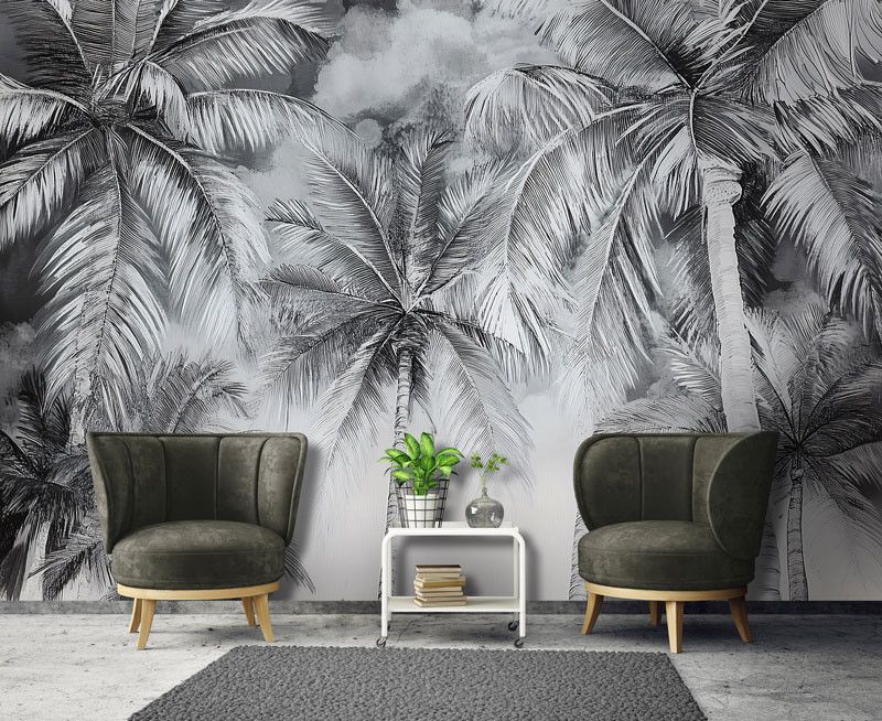 Dit fotobehang combineert schitterend met zowel moderne als klassieke interieurs en voegt een luxe en exotisch accent toe aan elke ruimte. De monochrome kleuren geven het geheel een serene uitstraling, terwijl de dynamische lijnen van de palmen voor diepte en levendigheid zorgen.