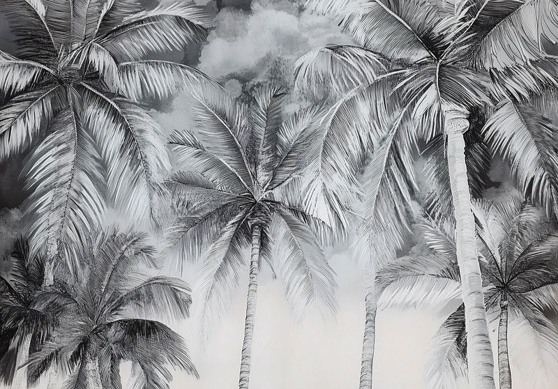 Breng een stijlvolle, tropische sfeer in je interieur met dit prachtige fotobehang. Het ontwerp toont imposante palmbomen in een artistieke zwart-witte illustratiestijl, waardoor een tijdloze en elegante uitstraling ontstaat. De verfijnde details en subtiele contrasten maken dit behang perfect voor woonkamers, slaapkamers of kantoren waar je een rustige, maar karaktervolle tropische sfeer wilt creëren.