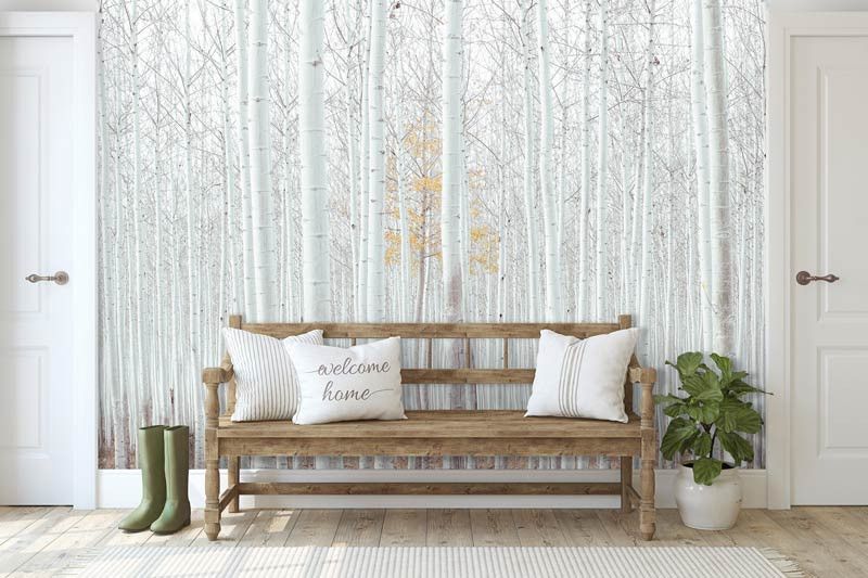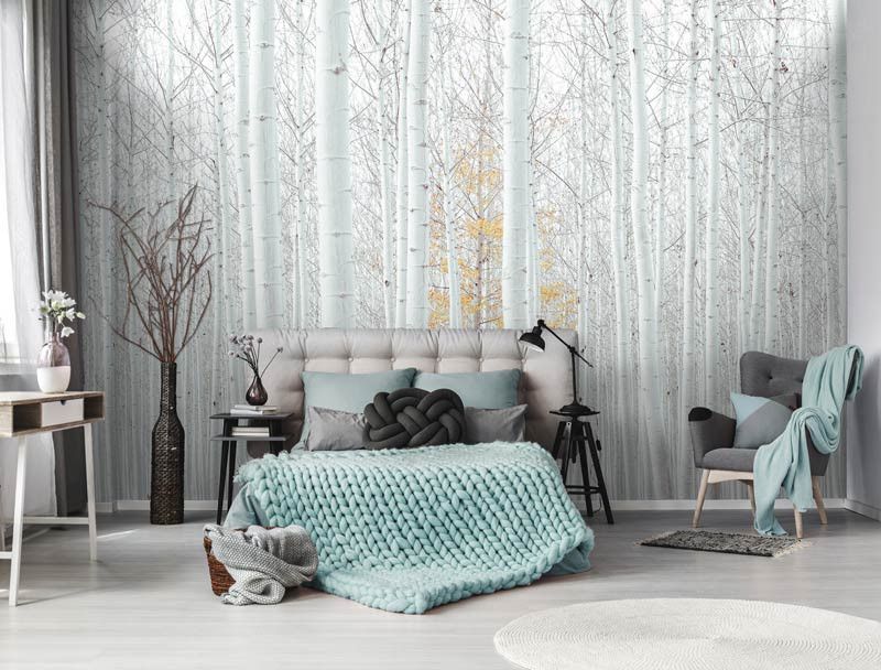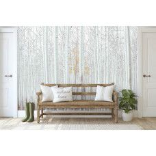 Fotobehang van een prachtig bos vol met witgekleurde bomen.