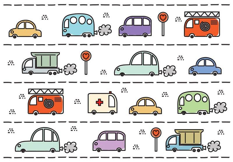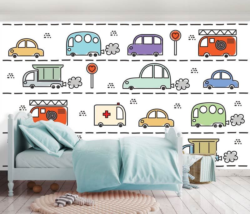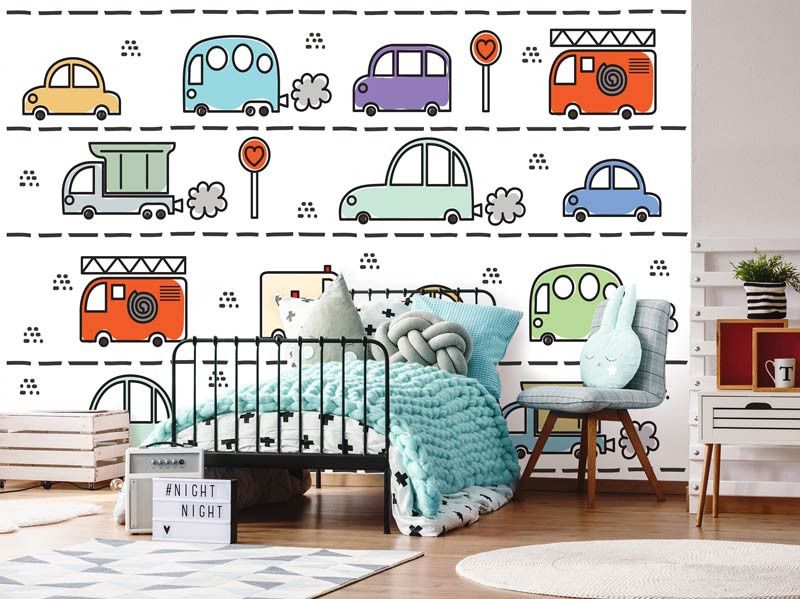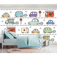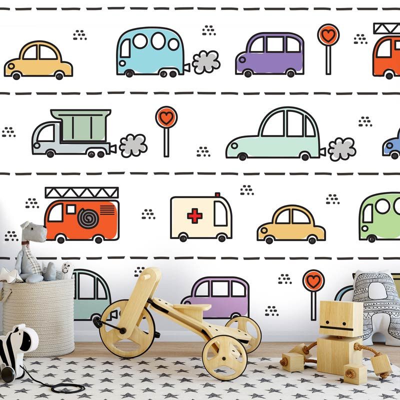 Fotobehang allerlei verschillende soorten en kleuren auto's. Het fotobehang van auto's is een echte eyecatcher in elke kinderkamer.