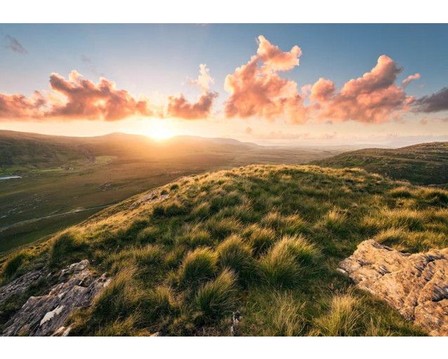 Zo ver het oog reikt zie je het schilderachtige groene heuvellandschap van Ierland.