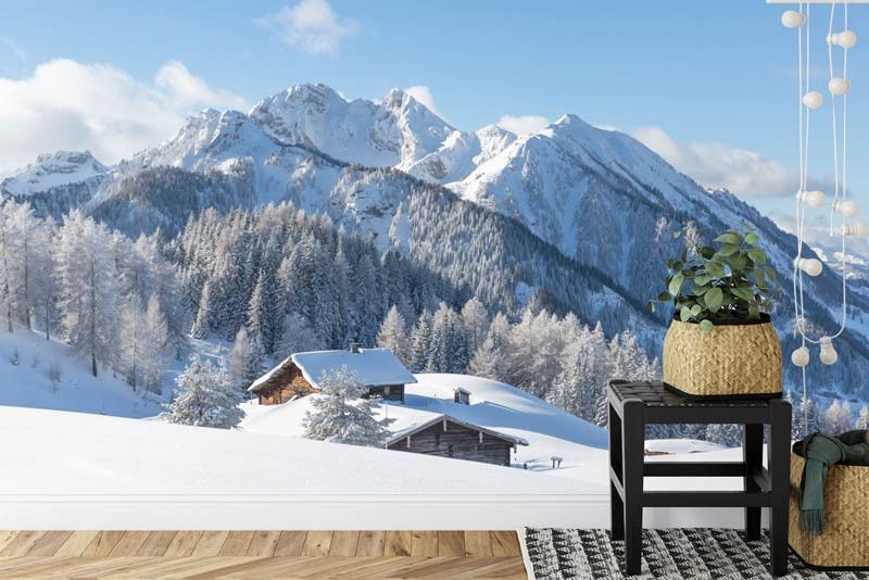 Creëer een ambiance van rust en sereniteit in je eigen thuisomgeving, of het nu je woonkamer, slaapkamer of studeerkamer is. Bestel nu je fotobehang op maat en geniet elke dag van de betoverende landschappen van berglandschappen in de sneeuw.
