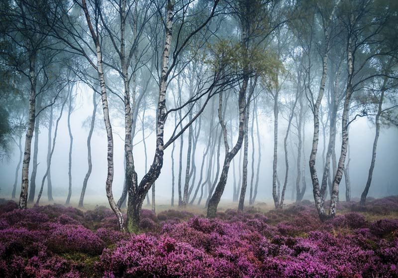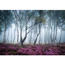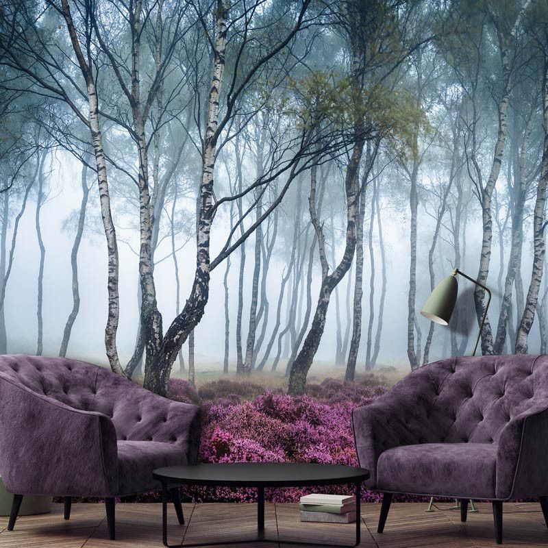 Fotobehang van een prachtig, mistig berkenbos vol met schitterende bloemen en bomen.