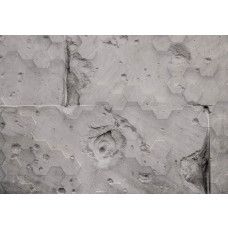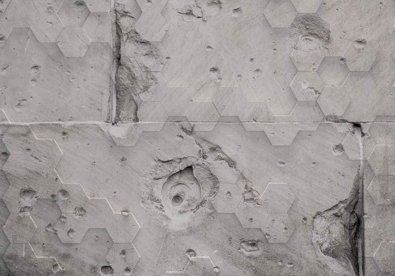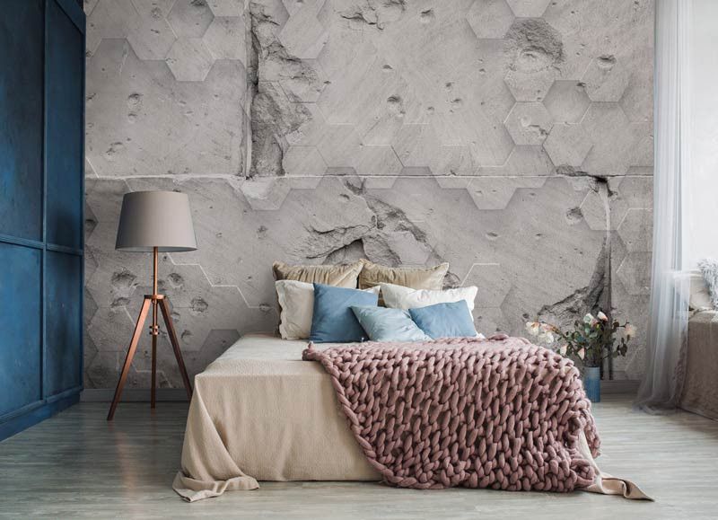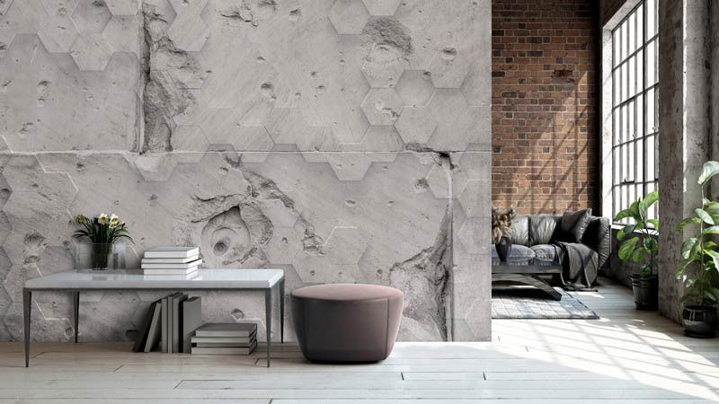 Fotobehang van een betonnen muur met daarin zeshoeken.