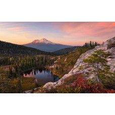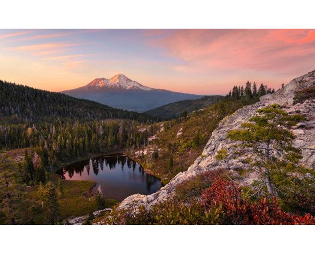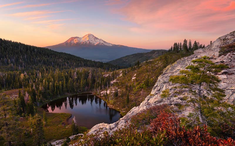 Een liefdesverklaring aan de natuur. Heart Lake in het zachte licht van de avondzon met uitzicht op Mount Shasta in Californië.