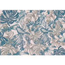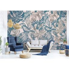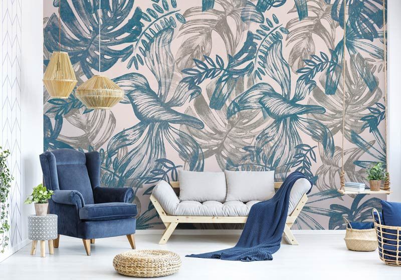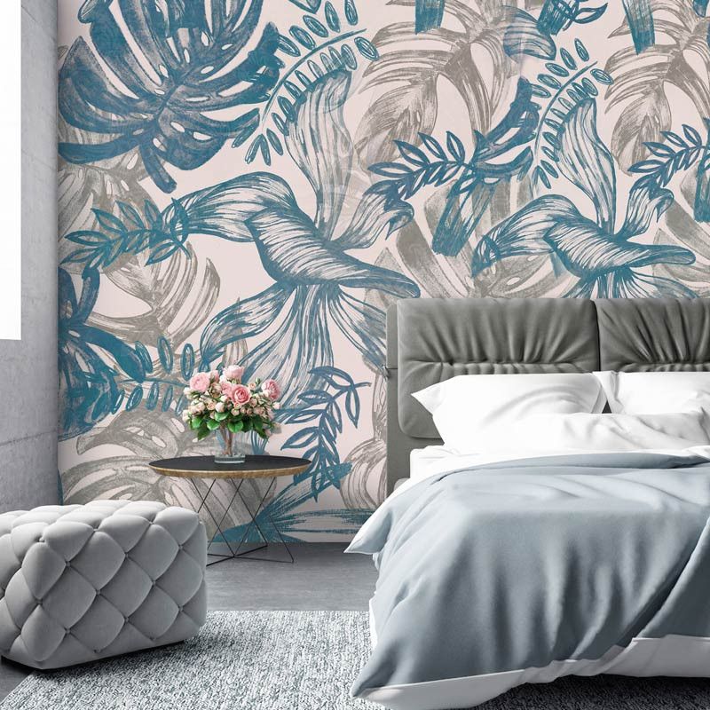 Fotobehang van geschilderde, blauwe en groene bladeren.