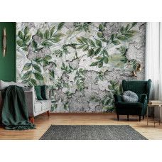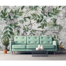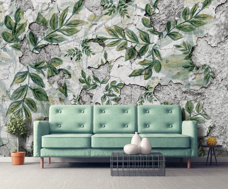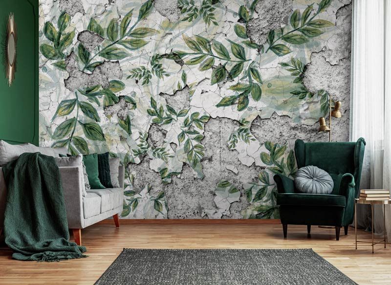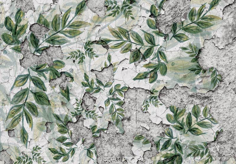 Fotobehang van bladeren op een betonnen muur.