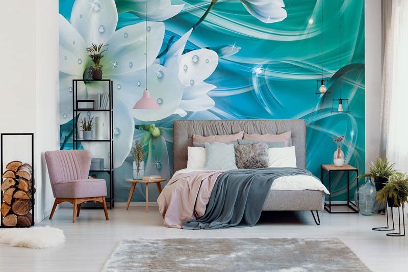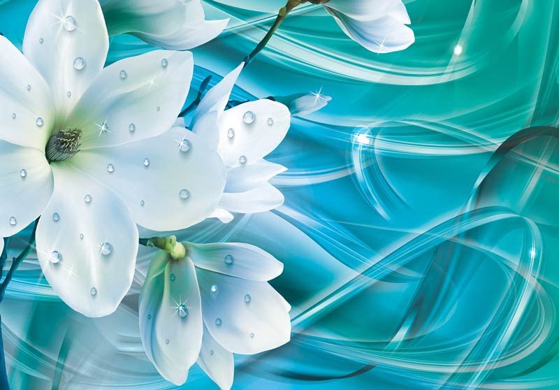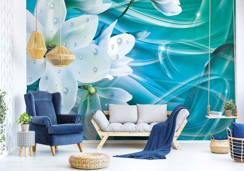Vliesbehang van glinsterende bloemen bovenop een golvend, schilderachtig, abstract kunstwerk. Dit fotobehang is een echte blinkvanger in de: woonkamer, slaapkamer, kinderkamer, hal, school, keuken, kantoor of iedere andere ruimte.