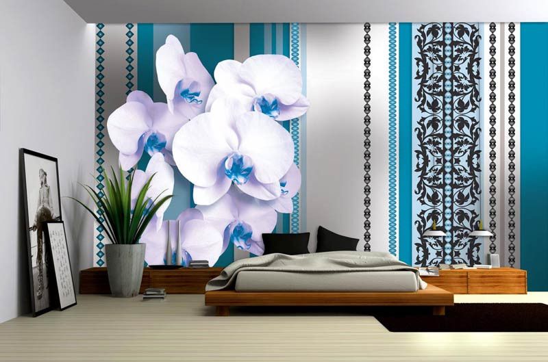 Vlies fotobehang van prachtige bloemen bovenop een chique patroon.