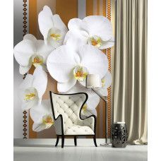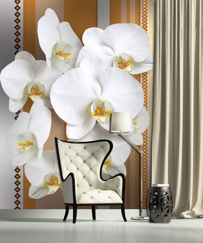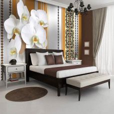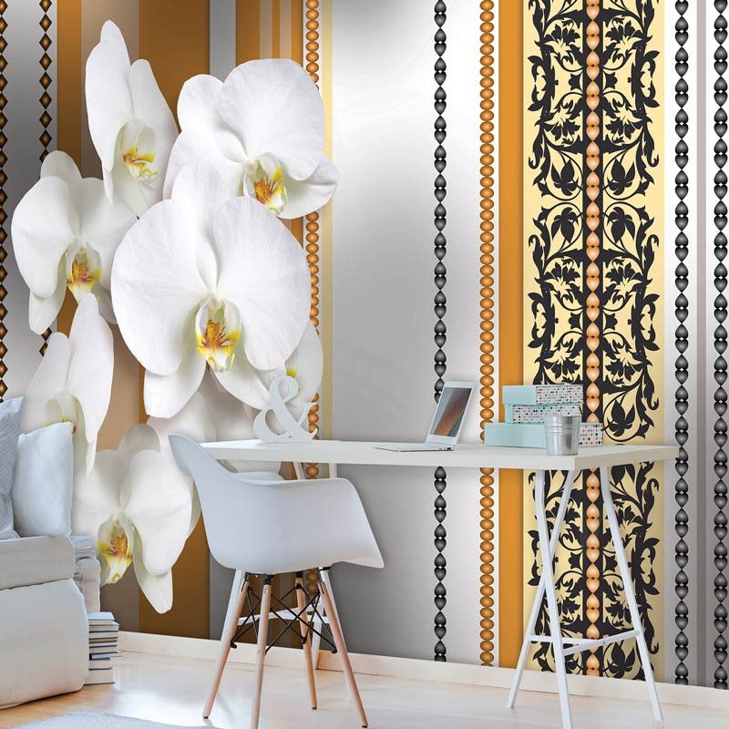 Vlies fotobehang van prachtige bloemen bovenop een chique patroon.