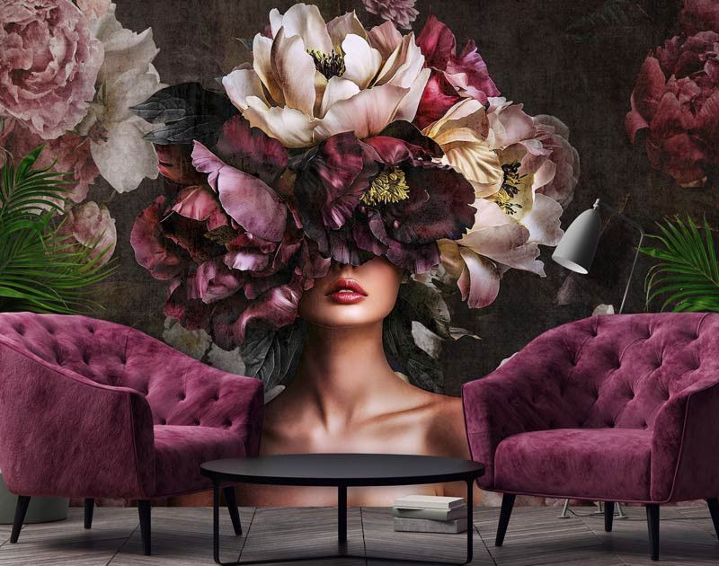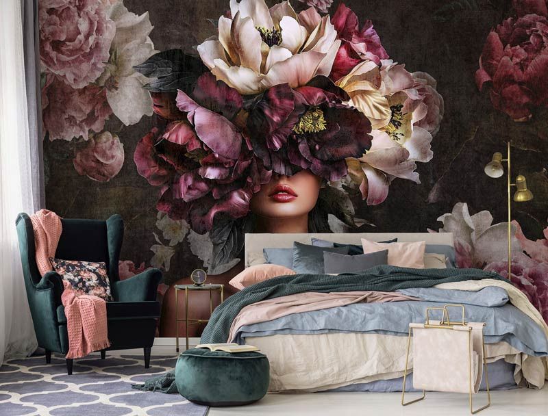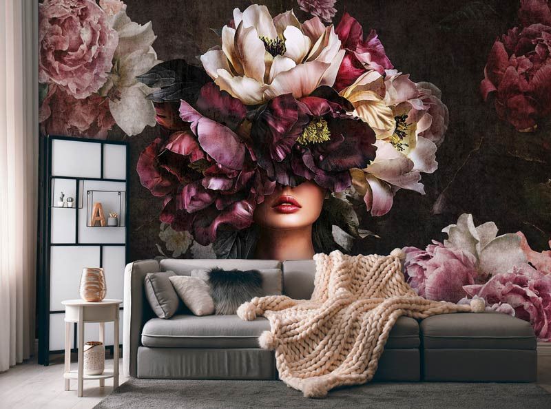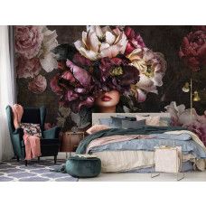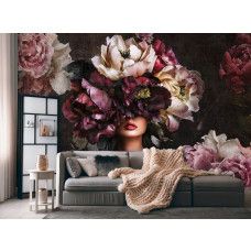 Een ware blikvanger vol kunst en vrouwelijkheid: dit fotobehang toont een portret van een vrouw met een bloemenkroon die haar ogen mysterieus bedekt. De combinatie van donkere tinten met rijke bloemdetails zorgt voor een expressief en romantisch beeld.