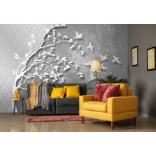 Abstract vlies fotobehang van een prachtige boom met daar omheen een aantal vogels, weergegeven op een zilveren achtergrond.