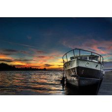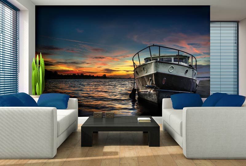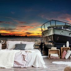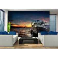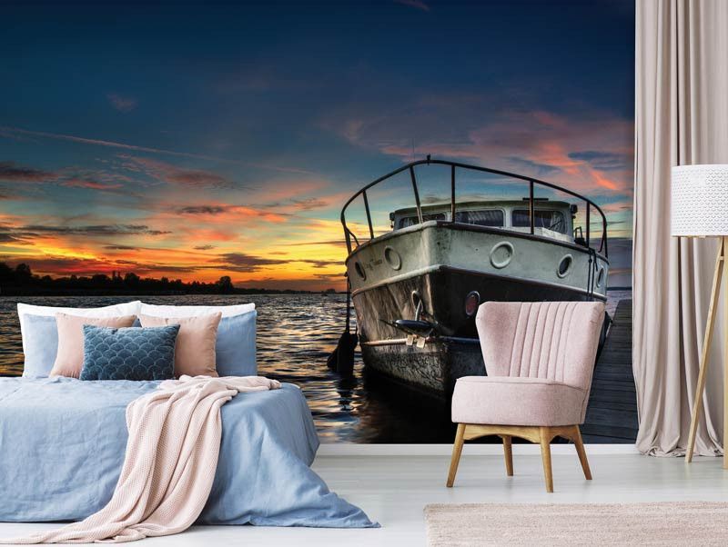Vliesbehang van een boot, op zee, bij een prachtige zonsondergang.