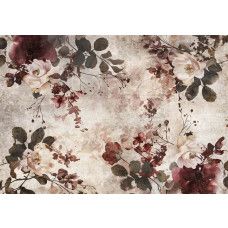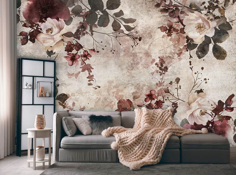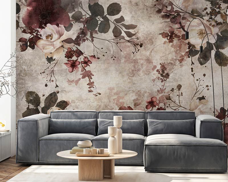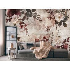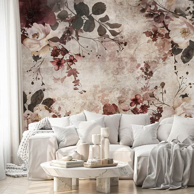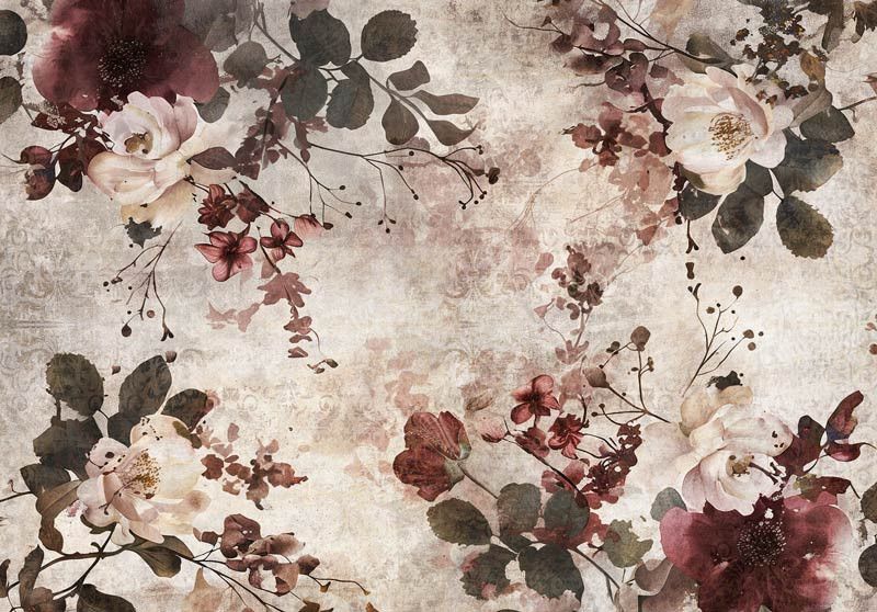 Fotobehang Bordeaux Rode Bloemen op Beton