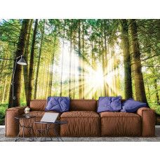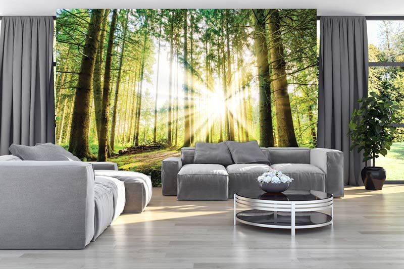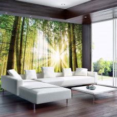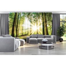 Vlies fotobehang van prachtig, groen bos met op de achtergrond de stralende zon.